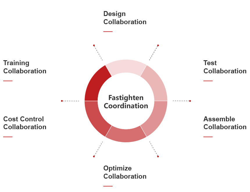 The so-called collaboration refers to the process or ability to coordinate two or more different resources or individuals to achieve a certain goal.Fastighten collaboration aims to provide more extensive and deep support for your purchase,provide comprehensive cooperation from the aspects of design,testing,optimization,cost control and training and pursue the most reasonable and effective perfect fastening scheme.